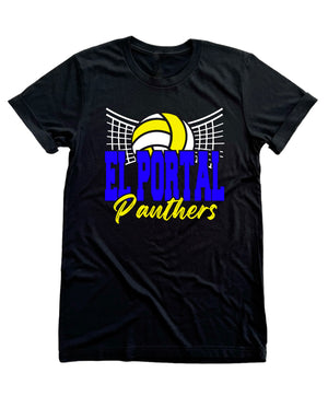 Celebrate your Panthers pride with the El Portal Volleyball Net shirt, showcasing a playful design of a volleyball net and ball. This lively shirt captures team spirit and adds a fun touch to your game day outfit, perfect for players and fans who love to show off their passion with energy and style.